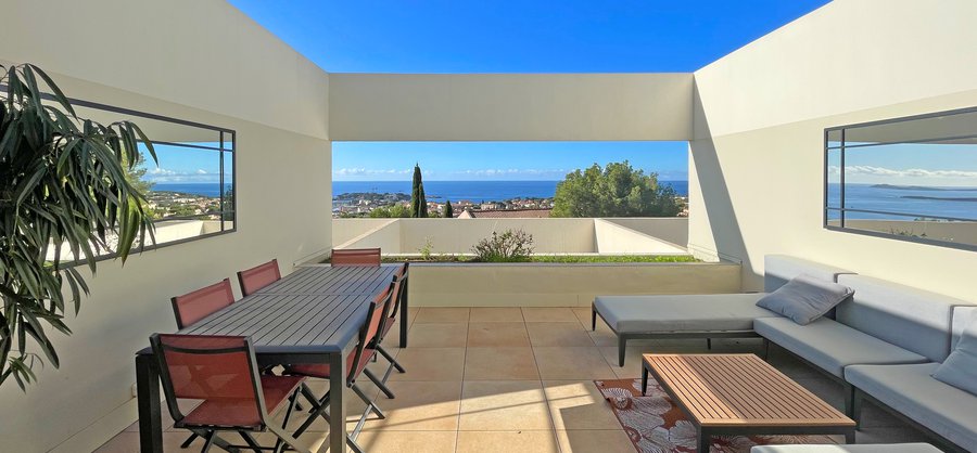 Dans une résidence sécurisée avec piscines et tennis, très bel appartement T2 entièrement rénové. Superbes volumes, séjour avec hauteur sous plafond de 5 m. Bien au calme et bénéficiant de prestations soignées : climatisation dans séjour et chambre, exposition sud avec magnifique vue mer, accès direct à une cr...